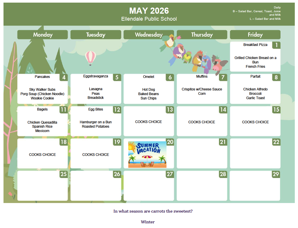 This month’s menu: Click on the date to see the breakfast & Lunch menus listed below the calendar.